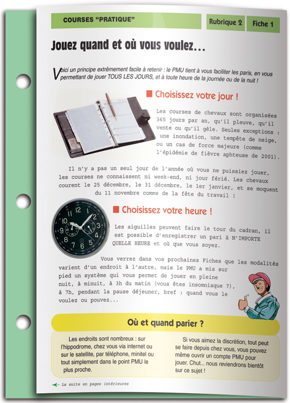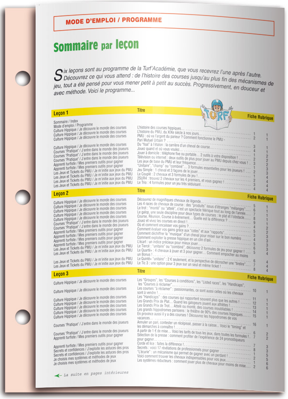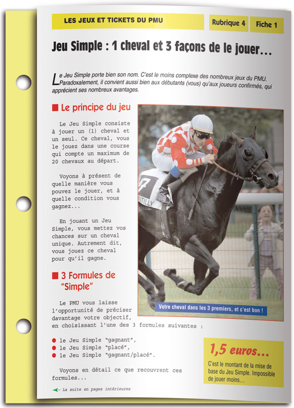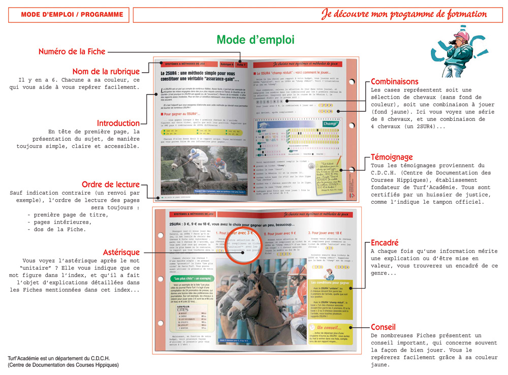 Mode d'emploiDans Votre première Leçon, une Fiche pédagogique “Mode d’emploi”... Ici, sur une Fiche consacrée à l’un des jeux du PMU (le 2SUR4), l’illustration de la façon dont sont bâties les Fiches du cours pratique de Turf’Académie : claires, précises, pratiques, illustrations et exemples (modèles de tickets remplis) à l’appui.