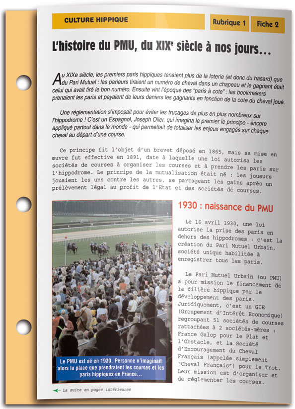 Dans cette rubrique vous découvrirez tout en vous distrayant, l’histoire des courses et des chevaux, mais aussi celle du PMU. Sans oublier les disciplines (Trot, Plat ou Obstacle), les hippodromes, les Grands Prix... |