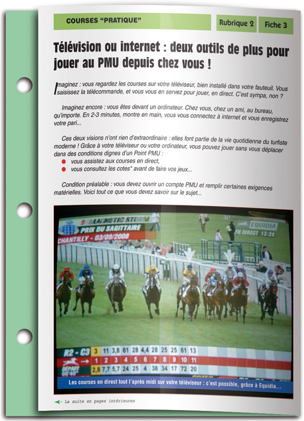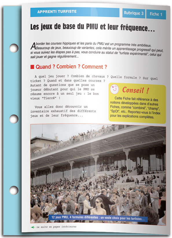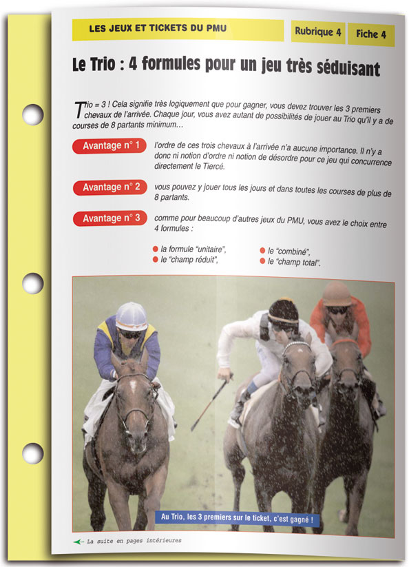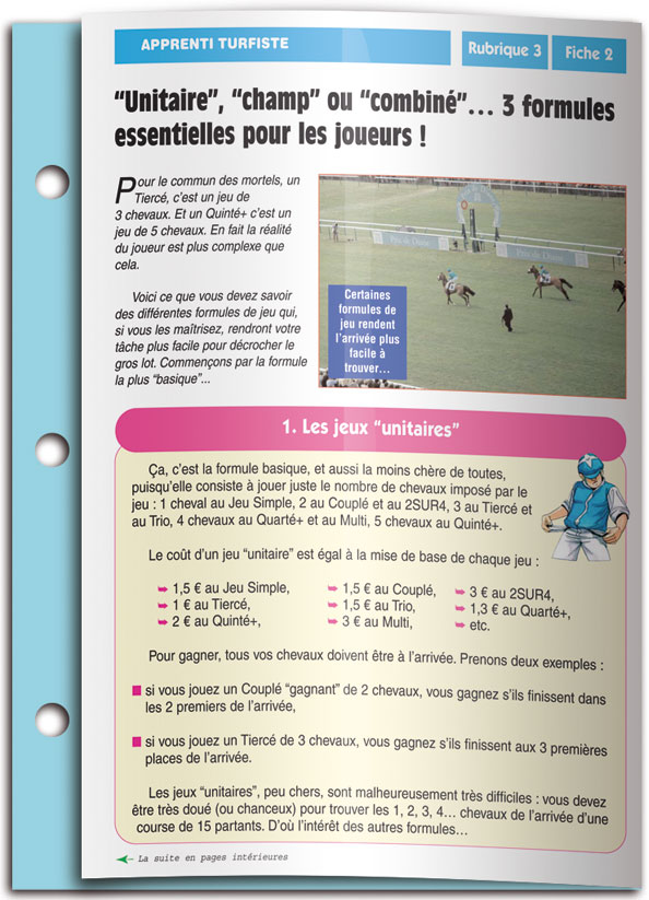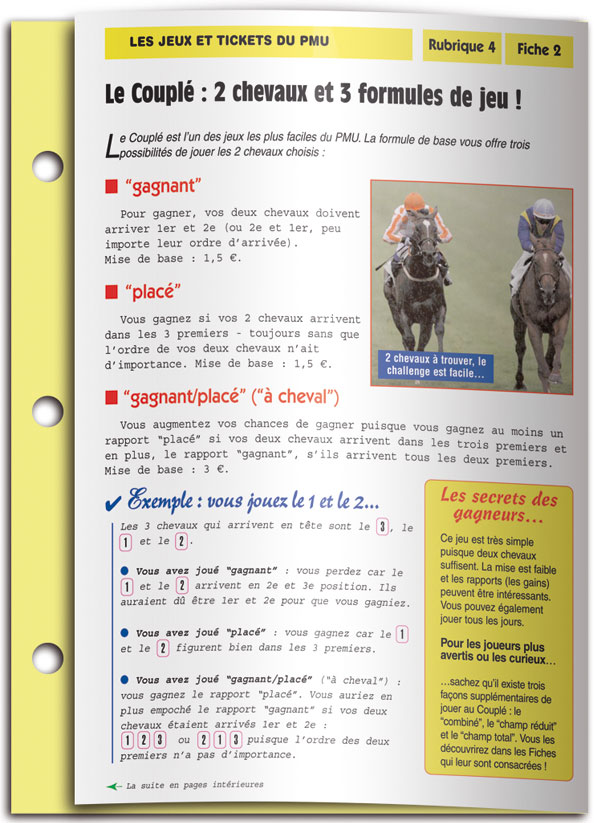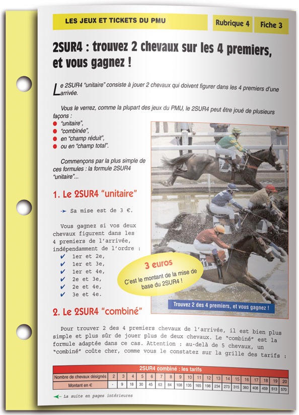 Dans Votre première Leçon, une Fiche pédagogique “Mode d’emploi”... Ici, sur une Fiche consacrée à l’un des jeux du PMU (le 2SUR4), l’illustration de la façon dont sont bâties les Fiches du cours pratique de Turf’Académie : claires, précises, pratiques, illustrations et exemples (modèles de tickets remplis) à l’appui.